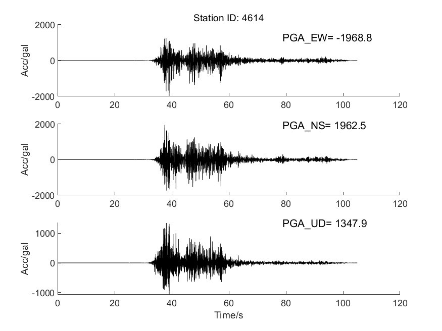 地震后強(qiáng)震動觀測中心收集獲取了距震中483公里范圍內(nèi)強(qiáng)震動記錄263組,并迅速組織人員進(jìn)行處理。獲取記錄臺站加速度記錄分析結(jié)果見表1(節(jié)選部分),其中4614臺PGA峰值最大,其震中距為42.4km,東西、南北、垂直向加速度峰值分別為-1968.8cm/s2、1962.5cm/ s2、1347.9cm/ s2,東西、南北、垂直向速度峰值分別為-51.3cm/s、66.8cm/s、-28.5cm/s,計算儀器地震烈度9.5度。