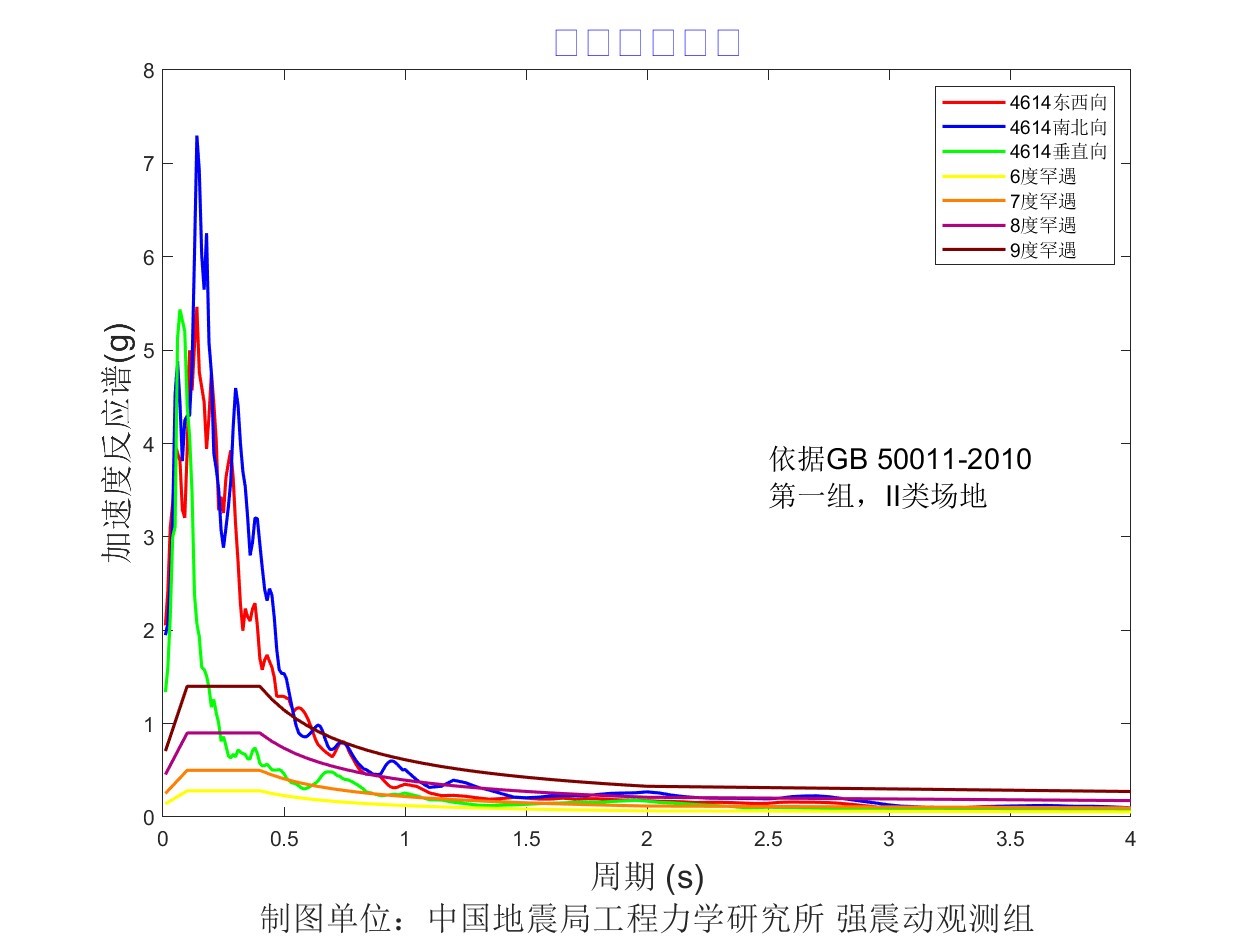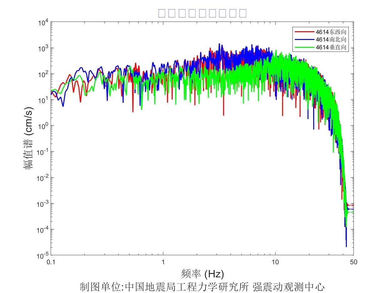 儀器地震烈度分布圖見圖1,地震峰值加速度分布圖見圖2,地震峰值速度分布圖見圖3,地震加速度反應(yīng)譜(T=0.3s、T=1.0s、T=3.0s)分布圖見圖4、圖5、圖6。4614臺強(qiáng)震動記錄見圖7,4614臺加速度反應(yīng)譜見圖8,4614臺傅里葉幅值譜見圖9。