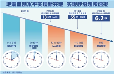 近年來(lái),我國(guó)地震預(yù)警信息產(chǎn)出速度不斷提升,從約10分鐘的人工速報(bào)到1至2分鐘的自動(dòng)速報(bào),再到秒級(jí)的地震預(yù)警,為抗震救災(zāi)提供了強(qiáng)大科技助力。(制圖:張寒)
