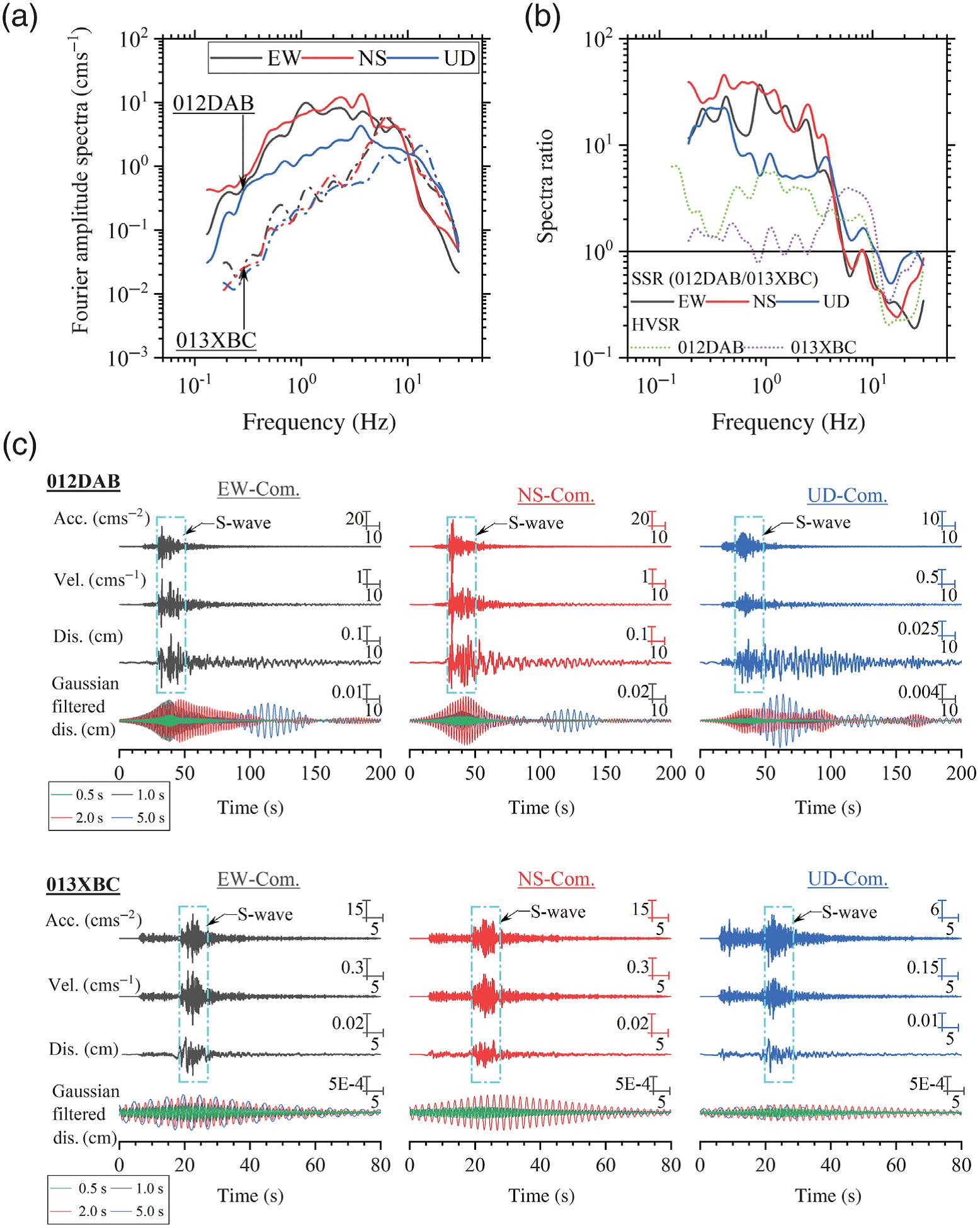 在數據質量篩查和數據處理后,選取242組高質量的地震動觀測記錄,首先利用垂直分量的擬加速度反應譜(PSA)分析了唐山地震帶的地震動距離衰減(見圖1),發現該地區的非彈性衰減很強,但幾何擴展較弱(見圖2),采用不同的幾何擴散表達形式來描述幾何擴展,發現三段線性幾何擴散模型可以很好的表示唐山地區的地震動距離衰減,在中等距離(60-100km)處并未出現幾何擴展衰減。PGA和PGV的空間分布出現高烈度異常區域(寧河-寶坻地區、北京南部等),根據寧河-寶坻地區和北京南部的地震動標準譜比的寬頻帶、高幅值特征及體波后顯著的長周期面波(見圖3),寧河-寶坻地區出現非常顯著的2-5s的盆地誘發面波,說明這些地區存在顯著的盆地放大效應,盆地放大效應造成了此次地震中的高烈度異常,這也可能是1976年唐山大地震中高強度異常區的原因之一。