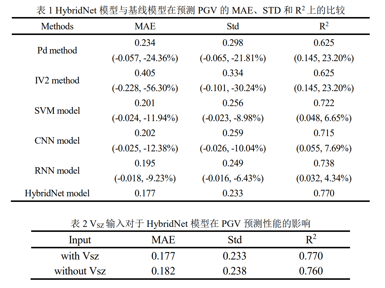 P波到達(dá)后1給出了Pd方法、SVM模型、RNN模型)的MAE)、標(biāo)準(zhǔn)差(R2)。表MAE、R2與MAE、R2之間的差值;括號(hào)里的第二個(gè)數(shù)字是MAE和HybridNet模型的1中可以發(fā)現(xiàn):和基線模型相比,2展示了場地特征HybridNet模型結(jié)果影響,這表明場地特征HybridNet模型輸入可以提高模型的性能。 3)對于獨(dú)立于訓(xùn)練集和測試集的M≥6.5),該工作分析了PGV對潛在破壞區(qū)域估計(jì)的可行性。圖P波到達(dá)后2中可以看到,基于PGV獲得的潛在破壞區(qū)域與ShakeMap有很好的一致性,且成功報(bào)警的準(zhǔn)確性達(dá)到了