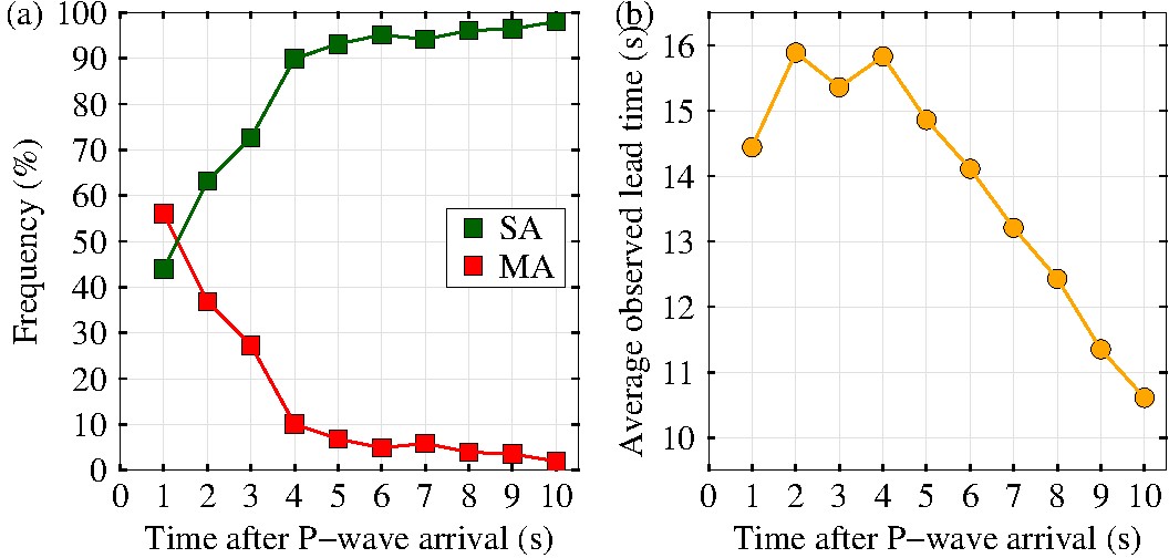 5次地震事件,在潛在破壞場地中,圖P波到達(dá)后時(shí)間窗的關(guān)系。從圖a)中可以看到:隨著P波到達(dá)后60%。此外,在10秒時(shí),成功報(bào)警率超過2%。從圖b)中可以看到:當(dāng)在4秒內(nèi),平均觀測預(yù)警時(shí)間超過P波到達(dá)之后時(shí)間的增加而逐漸減小。在10秒時(shí),平均觀測預(yù)警時(shí)間仍超過