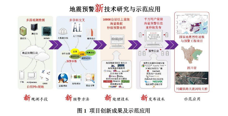項(xiàng)目緊緊圍繞國(guó)家重大建設(shè)項(xiàng)目“國(guó)家地震烈度速報(bào)與預(yù)警工程”實(shí)施中亟待解決的關(guān)鍵科技問題,針對(duì)確定地震預(yù)警參數(shù)的“快和準(zhǔn)”問題和地震預(yù)警系統(tǒng)建設(shè)的技術(shù)需求,按照“理論研究—技術(shù)研發(fā)—系統(tǒng)研制—示范應(yīng)用”的一體化實(shí)施路線,基于人工智能、大數(shù)據(jù)分析等先進(jìn)新興技術(shù),通過3年多的科研攻關(guān),實(shí)現(xiàn)了“新觀測(cè)手段、新預(yù)警方法、新處理技術(shù)、新發(fā)布技術(shù)”的“四新”創(chuàng)新點(diǎn),并在四川、云南、京津冀以及川藏鐵路成功進(jìn)行了示范應(yīng)用。
