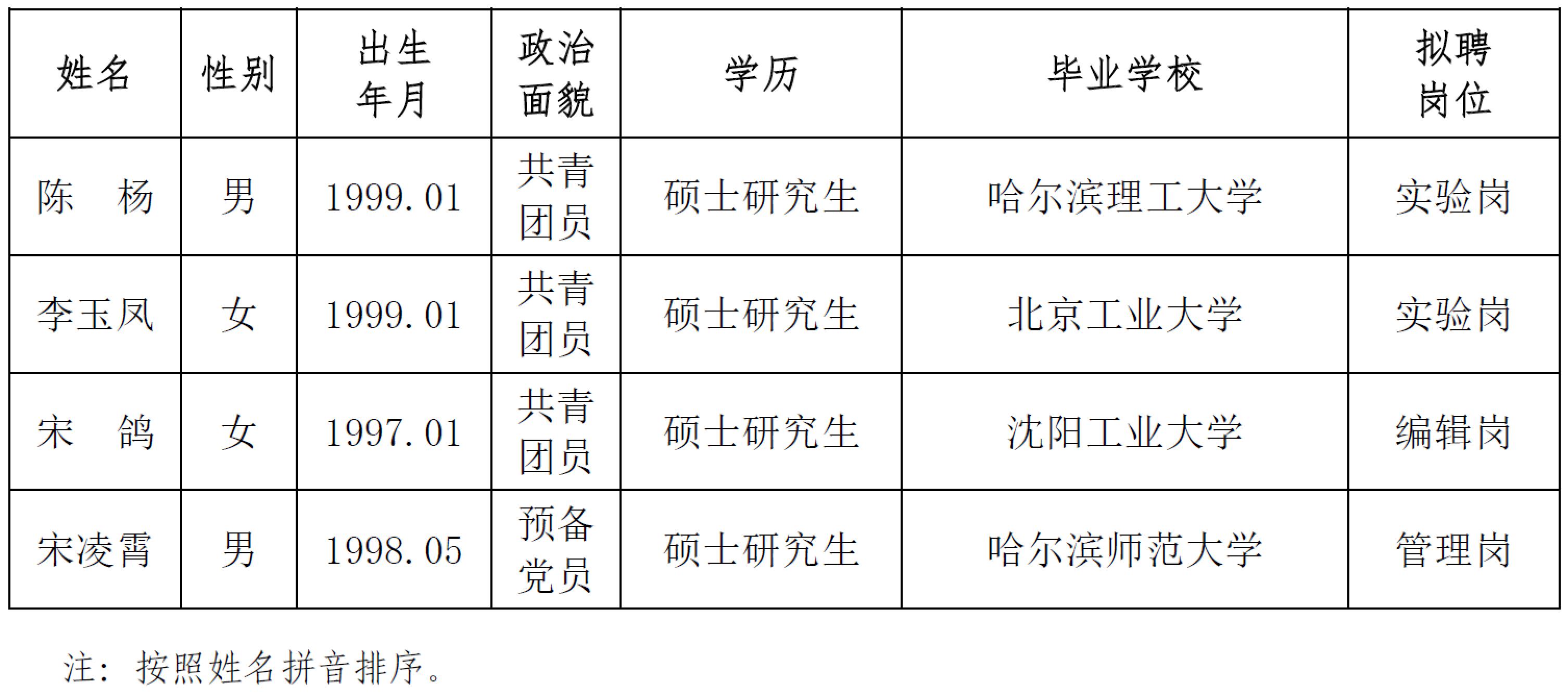 發布時間: 2024-05-14 點擊數量:14784根據中國地震局《關于貫徹執行〈事業單位公開招聘人員暫行規定〉的通知》文件精神和我所用人計劃,經公開發布招聘信息、資格審查、面試等程序確定擬錄人員。現將擬錄人員相關情況公示如下,公示期7個工作日,期間如有異議請與中國地震局工程力學研究所人才資源部或紀檢室聯系,以個人名義反映情況的領署真實姓名,以單位名義反映情況的須加蓋公章。