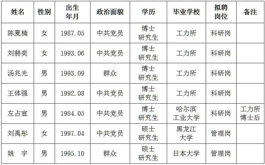 發布時間: 2022-05-30 點擊數量:12754根據中國地震局《關于貫徹執行〈事業單位公開招聘人員暫行規定〉的通知》文件精神和我所用人計劃,經公開發布招聘信息、資格審查、面試等程序確定擬錄人員。現將擬錄人員相關情況公示如下,公示期7天,期間如有異議請與中國地震局工程力學研究所人才資源部或紀檢室聯系,以個人名義反映情況的須署真實姓名,以單位名義反映情況的須加蓋公章。